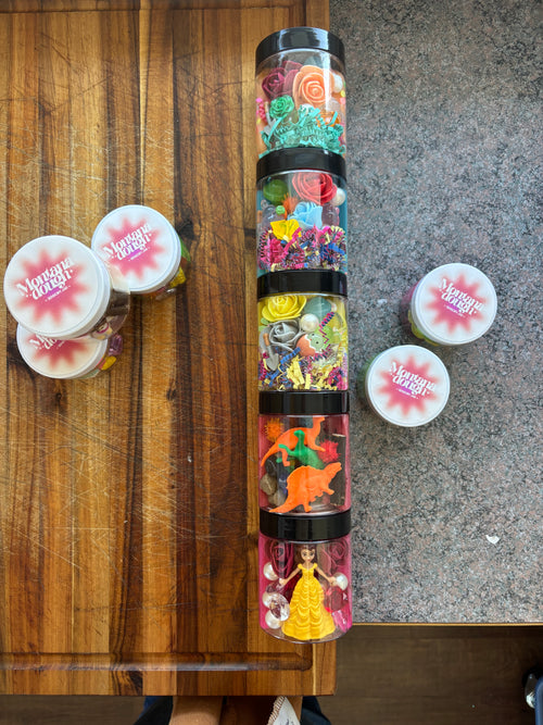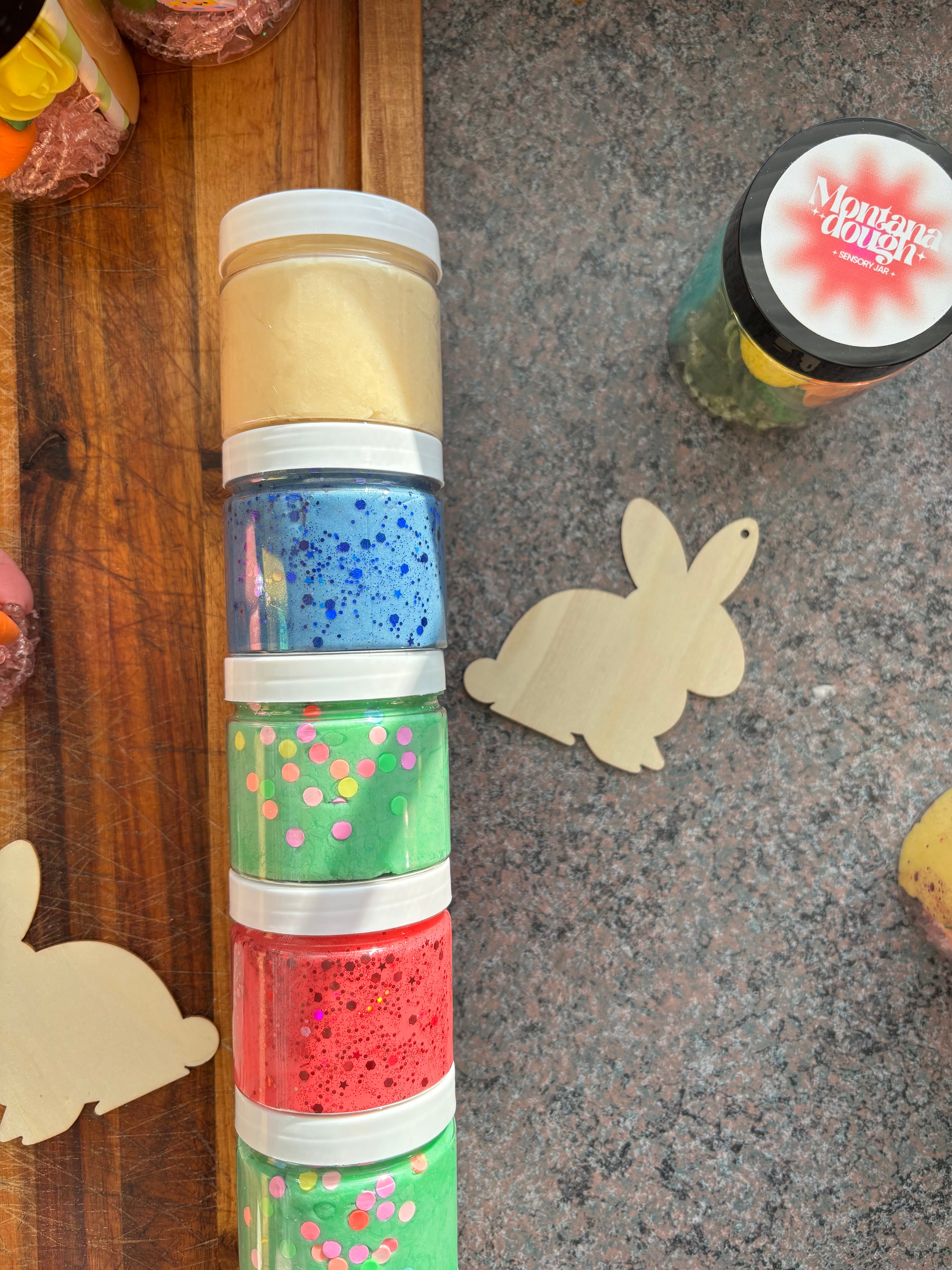 Themed sensory jars are filled with 4.5 oz of homemade play dough and themed toys.